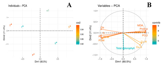 Score (A) and loading plot (B) of principal component analysis (PCA) on different studied attributes of C. capsularis seedlings plants supplemented with citric acid (CA) while grown under Cu stress. Score plot represents separation of treatments as (1) Cu0CA0 (Cu = 0 μM and CA = 0 mM), (2) Cu0CA1 (Cu = 0 μM and CA = 2 mM), (3) Cu1CA0 (Cu = 50 μM and CA = 0 mM), (4) Cu1CA1 (Cu = 50 μM and CA = 2 mM), (5) Cu2CA0 (Cu = 100 μM and CA = 0 mM) and (6) Cu2CA1 (Cu = 100 μM and CA = 2 mM). The abbreviations are as follows: PFW: plant fresh weight; PDW: plant dry weight; MDA: Lipid peroxidation; Pn: photosynthetic rate; Tr: transpiration rate; Gs; stomatal conductance; POD: peroxidase activity; SOD: superoxidase dismutase activity; Cu. S: Cu in shoots; and Cu. R: Cu in roots.