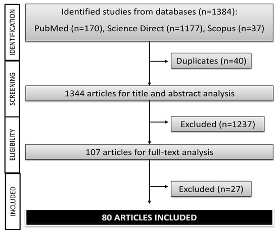 Initially, a total of 1384 studies were identified in Pubmed (n = 170), Science Direct (n = 1177), and Scopus (n = 37). However, 40 reports were deleted when appearing in two or more databases (duplicated). Then, 1264 articles were excluded after title and abstract analysis (n = 1237) and after full-text analysis (n = 27), 80 articles finally being included in this systematic review (Figure 1). Five studies of these 80 reports carried out both in vitro and in vivo experiments and one study in vitro and clinical trials.