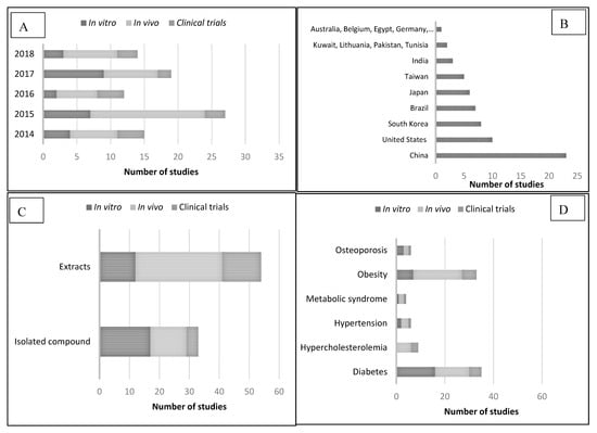 Appendix A (Table A1) and Appendix B (Table A2) include in vitro and in vivo pharmacological studies, respectively, and these studies were grouped based on disease, extract/isolated compound, experimental model, treatments, major findings, and references. Appendix C (Table A3) includes clinical trials and the main information contained was study (author, year, and country), study design, sample size, population, type of plant, intervention, duration of treatments, and results. Most papers were published in 2015 (n = 27, 29.3%) and 2017 (n = 19, 20.6%) (Figure 2A). All works included in this systematic review were conducted by research groups of 23 countries, the majority of them from China (n = 23, 28.75%), United States (n = 10, 12.5%), and South Korea (n = 8, 10%) (Figure 2B). These studies were carried out with extracts (n = 54, 67.5%) and isolated compounds (n = 33, 41.25%) from Camellia sinensis. Particularly, extracts were the part of the plant most studied in in vivo studies and clinical trials whereas isolated compounds were in the in vitro studies. Regarding endocrine and metabolic disorders, diabetes and obesity were the most studies pathologies (n = 35 and n = 33, respectively) followed by hypercholesterolemia (n = 9), osteoporosis (n = 6), hypertension (n = 5) and metabolic syndrome (n = 4). Particularly, diabetes was the most study disease in in vitro studies (n = 16) and obesity in in vivo studies (n = 20), and clinical trials (n = 6). In several in vitro and in vivo studies, the effect of extracts and isolated compounds of Camellia sinensis on two different pathologies were studied in the same research work [9,10,11,12,13,14,15,16]. This review is divided into six sections, based on the pathologies, diabetes, hypercholesterolemia, hypertension, metabolic syndrome, obesity, and osteoporosis. Within each pathology, pharmacological activities of tea isolated compounds and extracts was classified in terms of signal transduction, redox system, and changes of biomarkers.