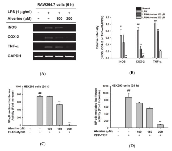 3.2. Alverine Suppressed iNOS, COX-2, and TNF-α mRNA Expression through NF-κB Inhibition