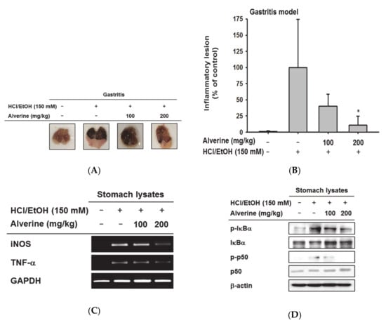 3.4. Alverine Exerted Anti-Inflammatory Effects in an HCL/EtOH-Induced Gastritis Mice Model
