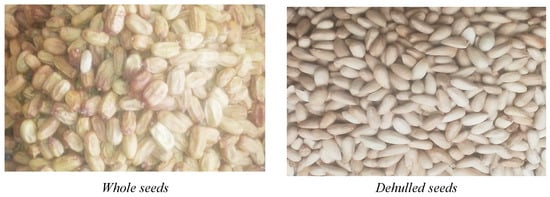 There is only one variety of neem (Azadirachta indica A. Juss) in Cameroon. The two lots of neem seeds samples used for this study come from two localities in the Far North region of Cameroon with different geographic and climatic characteristics. Samples of seeds were collected in three different districts of the city of Maroua (“Pitoaré”, “Djarengol” and “Domayo”) and samples from Zidim, a locality of the department of Mayo Tsanaga, located about 48 km from the city of Maroua. Three samples were collected at different locations in each of these two localities. These neem seeds were obtained during the abundant fruiting period in March 2018 and then cleaned, dried, and stored at room temperature, protected from light and moisture and then the studies were conducted in April 2018. Their moisture contents were 9.533 ± 0.089 and 9.470 ± 0.049% for the Maroua and Zidim samples, respectively. The trials were carried out on whole seeds, depulpated seeds, almonds, hulls and pulps. In order to perform a physicochemical characterization of whole seeds, the samples received a series of pretreatment operations. They were cleaned and then dewatered by dipping them in water. The depulped seeds were dried at room temperature and then peeled to separate the shell from the kernel as shown in Figure 1.