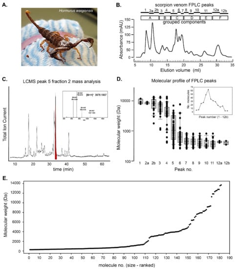 Molecular analysis of pooled venom from Australian scorpion Hormurus waigiensis. (A) Image of a scorpion on the pad used for venom collection by electrical stimulation of the telson. (B) The crude venom chromatogram at A280nm from SE-FPLC highlighting the 12 resolved peaks (designated as peak samples 1–12b); venom Pools (A–F) used for the bio-impedance study are shown in relation to the corresponding peak samples and the elution fractions. (C) An example of the LCMS analysis for the second elution fraction (EF 20) within peak sample 5, where 41 molecular weights were identified. The inset mass spectrum illustrates an example of the underlying mass spectra of the highlighted (red) LCMS chromatogram peak and the corresponding molecular weight of the molecule. (D) A box plot analysis of the molecular weight distributions of all 14 peak samples (see also Table S1). The boundaries of the box plots represent 25% and 75% percentiles, the solid line is the median, the dashed line is the mean, 95% percentiles are also shown; individual data points are overlaid. The inset shows the number of distinct molecules identified within each peak sample. (E) Size-ranked plot of the molecular weights of the 182 molecules identified in the venom fractions.