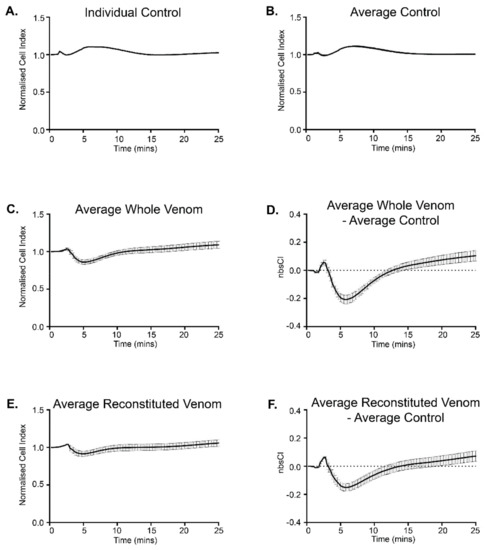 Investigation of the effect of whole and fractionated venom on membrane impedance was undertaken using the xCELLigence platform. Negative controls consisting of PBS eluted from the SE-FPLC were used to establish a baseline profile with solution switching (n = 8). HEK293 cells are known to be sensitive to mechanical disturbances, as exhibited by changes in cytosolic Ca2+ [49]. This responsivity was confirmed in the present study by the readout of the GCaMP5G-RyR1-HEK293 (rHEK293) cell monolayer impedance in these negative controls (Figure 2A,B). The profile was highly reproducible as evident in Figure 2B, which shows the average of the individual control responses. These data show a small transient increase in normalized cell index (CI) to 1.023 ± 0.011 (n = 5) at approximately 105 s, followed by a subsequent delayed increase in impedance to a maximum CI of 1.112 ± 0.009 at 7.5 min, where normalized CI = 1 prior to sample addition. This average control profile was subsequently subtracted from the individual responses to whole venom (n = 6), reconstituted whole venom (n = 6), and pooled SE-FPLC elution fractions: Pool A (n = 8); Pool B (n = 9); Pool C (n = 7); Pool D (n = 5); Pool E (n = 7); Pool F (n = 6).