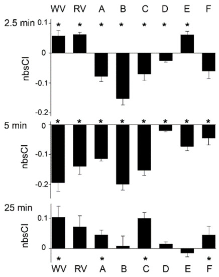 Summary of temporal profiles for xCELLigence—based bio-impedance to application of venom fractions from Australian scorpion Hormurus waigiensis to GCaMP5G-RyR1-HEK293 cell monolayers. Normalized background subtracted cell index data (nbsCI). WV, whole venom; RV, reconstituted venom; (A), venom Pool A (peak samples 1, 2a, 2b); (B), Pool B (peak samples 3, 4); (C), Pool C (peak samples 5, 6, 7); (D), Pool D (peak samples 8, 9, 10); (E), Pool E (peak sample 11); (F), Pool F (peak samples 12a, 12b)—see Supplementary Materials Tables S3–S6 for statistical comparisons. * indicates p < 0.05 for one sample t-tests; SEM error bars shown.