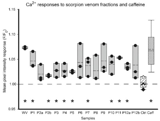 Sigmaplot (Systat v.12.5) as used for statistical analysis. Data are presented as mean ± s.e.m. For whole venom, SE-FPLC peak samples, controls (PBS and media samples) and caffeine, Ca2+ responses were determined using single sample t-tests (single-tailed), or one sample Signed Rank Tests if data were not normally distributed. The alpha value for significance was 0.05, assessing a difference from a predicted mean value of 1.00. With validation of normal distribution, comparison of samples against the control group was then undertaken using one-way ANOVA, with post-hoc Bonferroni-corrected pairwise comparison. T-tests (two-tailed) were used to compare the SCTX Ca2+ responses against the caffeine responses.