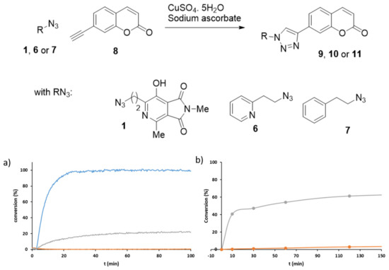 Figure 3. Comparison of kinetics of CuAAC reactions of: (a) 7-ethynyl coumarin (17.5 μM), with azide (1 in grey, 6 in blue, and 7 in orange) in the presence of CuSO4·5H20 (17.5 μM) and sodium ascorbate (437 μM) in DMF:PBS pH 7.4:H2O (1:1:2); (b) 7-ethynyl coumarin (175 μM), with azide (1 in grey, and 7 in orange) in the presence of CuSO4.5H2O (175 μM) and sodium ascorbate (4.375 μM) in DMF:PBS pH 7.4:H2O (1:1:2).