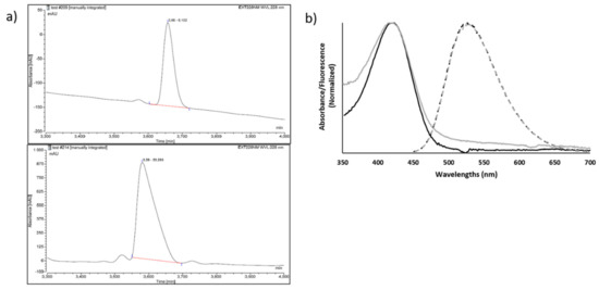 The reaction was monitored by HPLC and showed a clean and complete reaction within 30 min (Figure 4a). The isolated conjugate 13 obtained in a 38% isolated yield after RP-HPLC and lyophilization was subject to photophysical measurements. Absorption and emission spectra recorded either in the presence or absence of copper(I) (generated in situ from CuSO4·5H2O and sodium ascorbate), showed no change in positions of peak maxima, which were found at λabs ~ 416 nm and λem ~ 525 nm, respectively (Figure 4b). Only a widening of the absorption peak was observed. Besides, quantum yield for the green fluorescence-labeled peptide was found to be around 8% in the presence and absence of in situ generated copper(I) determined in PBS pH 7.4 at 25 °C. This value is in line with those reported for similar azaphthalimide derivatives [29].