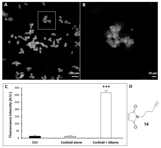 Figure 5. (A,B) PC12 cells in «Cocktail+Alkyne» conditions, acquired under mozaic confocal image for cell population observation (A) and single images for cellular observation (B). (C) Fluorescence intensity graph showing high significance (*** p < 0.001) of the fluorescence intensity level after «Cocktail+Alkyne» incubation versus «cocktail alone» and PBS incubation (ctrl). (D) Chemical structure of alkynyl maleimide 14.
