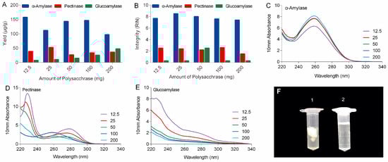 Comparison of the yield (A), integrity (B), and purity (Nanodrop spectrophotometric measurements in C–E) of total RNA isolated from ginseng roots using PARI method with different amount of α-amylase, pectinase and glucoamylase. (F) Comparison of precipitation before (no. 1) and after (no. 2) α-amylase digestion.