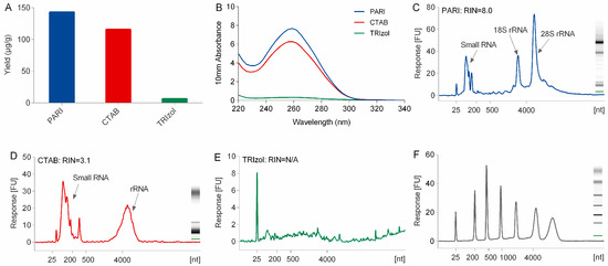 Comparison of the yield (A), purity (B), and integrity (RIN values reported by bioanalyzer in C–E) of ginseng RNA isolated using the PARI mehthod, TRIzol reagent, and CTAB method. (F) RNA ladder (25–6000 mer).