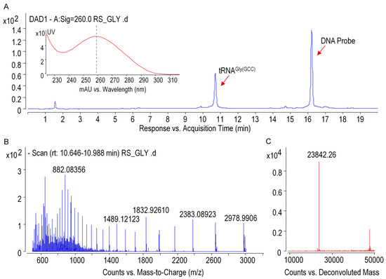 Qualification of purified tRNAGly(GCC) by using mass spectrometer. (A) UHPLC-DAD chromatogram (the inset shows UV-absorption spectrum of tRNA), (B) ESI-MS spectra of tRNAGly(GCC) with multiple negative charges, and (C) deconvoluted MS spectra of tRNAGly(GCC).