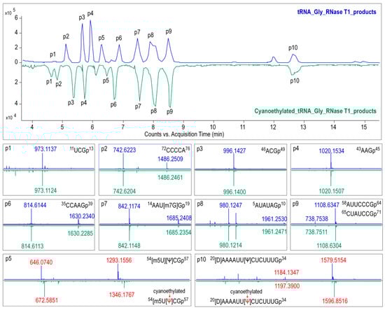 Baseline peak chromatograms (BPC) from LC-MS/MS analysis of RNase T1 digests of tRNAGly(GCC) treated with (green) or without (blue) acrylonitrile. Mass spectra corresponding to each peak (p1 to p10) are extracted and displayed below the BPC. The red tag indicates the precursor ions with mass shift (of 53.027 for single charged ions) corresponding to the presence of cyanoethylated pseudouridine (Ψ) in the digestion products.