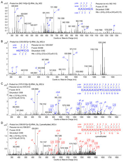 Pseudouridine (Ψ), a mass-silent modified nucleoside that cannot be detected by MS directly, was distinguished from uridine bycyanoethylation with acrylonitrile. When comparing the MS1 spectra in Figure 6, it is evident that two cyanoethylated digestion products in peaks 5 and 10, 20[D]AAAAUUUCUCUUUGp34 + C3H3N (m/z 1596.85) and 54[m5U]UCGp57 + C3H3N (m/z 672.59), give a mass increment of 53 Da compared with the untreated digestion products, indicating that each of them harbors one Ψ. A pseudouridine was assigned to U55 because it is the only nucleoside that could be turned into Ψ in 54[m5U]UCGp57. Positions of Ψ in the other digestion products were determined by LC-MS/MS analysis. The CID mass spectra in Figure 7D pictured the structures as 20[D]AAAAUU[Ψ]CUCUUUGp34 (p-scores = 63.30). At this point, the identity and location of modified nucleosides, including m7G, D, T, Ψ, in ginseng tRNAGly(GCC) were affirmatively identified from the combination of intact mass and sequence confirmation (Figure 8A).