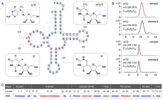 (A)Secondary structure of ginseng chloroplastictRNAGly(GCC). Modified nucleosides are indicated in red. (B) Position isomers of monomethylated G and U are identified based on their retention times in standard UHPLC separation system. (C) Formating and numbering of nucleotides in tRNAGly(GCC) have been done in accordance with Sprinzl et al. [24]. Stems are highlighted in blue and loops are indicated in red. Positions 17 and 47, which are empty, are indicated by dashes.