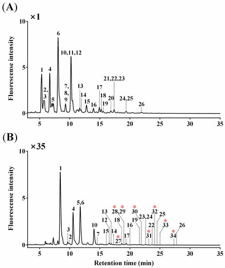 UPLC chromatograms of (A) AB-labeled (major and minor) O-glycans (Peaks 1–26) and (B) ProA-labeled (trace) O-glycans (Peaks 27–34; red asterisks) from BSM.