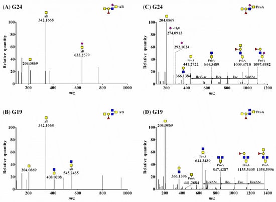 Figure 2 shows the MS/MS fragmentation of O-glycans labeled with AB (A and B) and ProA (C and D), indicated by G24 (Neu5Ac1Fuc1Gal1GlcNAc1GalNAc2) and G19 (Fuc1Gal1GlcNAc2GalNAc2). The MS/MS spectra revealed the presence of [N-acetylhexosamine(HexNAc)-AB]+ (theoretical m/z = 342.1660; observed m/z = 342.1668 in Figure 2A,B) or [HexNAc-ProA]+ (theoretical m/z = 441.2707; observed m/z = 441.2722 in Figure 2C and m/z = 441.2684 in Figure 2D) oxonium ions.