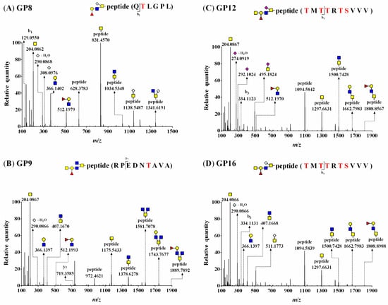 As shown in Figure 3, the MS/MS spectra showed common oxonium ions and fragment ions, indicating the presence of O-glycan constituents: [HexNAc]+, [Neu5Gc–H2O]+, [Neu5Gc]+, and [Fuc1Hex1HexNAc1]+ (theoretical m/z = 204.0867 (Figure 3A–D), m/z = 290.0870 (Figure 3A,B,D), m/z = 308.0976 (Figure 3A), m/z = 512.1974 (Figure 3A–C)) with a mass error of <5.0 ppm. The glycosylation sites included a peptide (Y0) ion and a peptide with a HexNAc (Y1) ion that was observed as the predominant peak at m/z 831.4570 (Figure 3A) or m/z 1175.5433 (Figure 3B) in the MS/MS spectra. Additionally, the spectra provided part of a peptide backbone sequence, yielding masses for b1 (observed m/z = 129.0550) (Figure 3A) and y7 (observed m/z = 719.3585) (Figure 3B).