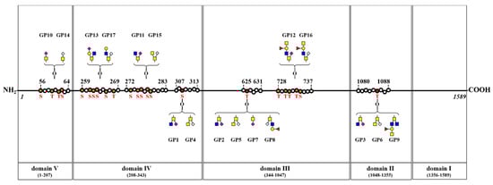 Sialylated O-glycans are attached at Domains II (1 site), III (2 sites), IV (3 sites), and V (1 site). Fucosylated O-glycans are attached at Domains II (1 site) and III (2 sites). A terminal-galactosylated O-glycan is attached at Domain IV (1 site). Additionally, G33 was detected in trace amounts of BSM, but GP16 (containing G33) was identified at Domain III.