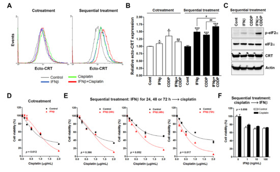 Effects of interferon β (IFNβ) and cisplatin treatment protocols on cell viability and surface calreticulin expression in HeLa cells. (A) HeLa cells were cotreated with 100 ng/mL IFNβ and 2 μg/mL cisplatin for 24 h, or sequentially treated with 100 ng/mL IFNβ for 24 h and 2 μg/mL cisplatin for another 24 h. Surface calreticulin (CRT) (ecto-CRT) staining was performed and analyzed by flow cytometry. (B) The mean fluorescence of ecto-CRT in (A) was quantified and plotted. p < 0.05 (* or #), p < 0.01 (** or ##) and p < 0.001 (***) indicate significant differences compared to control samples or the indicated group. (C) HeLa cells were sequentially treated with 100 ng/mL IFNβ for 24 h and 2 μg/mL cisplatin for another 4 h. Protein expression was analyzed by Western blotting. (D–F) For the concurrent treatment (cotreatment) protocol (D), HeLa cells were treated with 100 ng/mL IFNβ and the indicated doses of cisplatin for 72 h. For IFNβ-cisplatin sequential treatment protocol (E), HeLa cells were treated with 100 ng/mL IFNβ for 24, 48, or 72 h, and then cells were replated in 96-well plates and treated with the indicated doses of cisplatin for 72 h. Cell viability was examined by MTT assay. For the cisplatin-IFNβ sequential treatment protocol (F), HeLa cells were treated with 0.25 μg/mL cisplatin for 24 h, and then cells were replated in 96-well plates and treated with the indicated doses of IFNβ for 72 h.