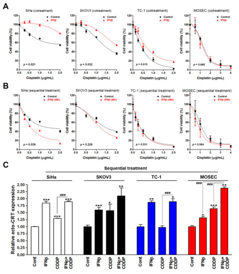 Effects of interferon β (IFNβ) and cisplatin treatment protocols on cell viability and surface calreticulin expression in cancer cells. (A) SiHa, SKOV3, TC-1, and MOSEC cells were cotreated with 100 ng/mL IFNβ and the indicated doses of cisplatin for 72 h. Cell viability was examined by MTT assay. (B) SiHa, SKOV3, TC-1, and MOSEC cells were treated with 100 ng/mL IFNβ for 48 h, and then cells were replated in 96-well plates and treated with the indicated doses of cisplatin for 72 h. Cell viability was examined by MTT assay. (C) SiHa, SKOV3, TC-1, and MOSEC cells were sequentially treated with 100 ng/mL IFNβ for 24 h and 2 μg/mL cisplatin for another 24 h. Surface CRT (ecto-CRT) staining was performed and analyzed by flow cytometry. The mean fluorescence of ecto-CRT was quantified and plotted. p < 0.05 (*), p < 0.01 (**) and p < 0.001 (*** or ###) indicate significant differences compared to control samples or the indicated group.