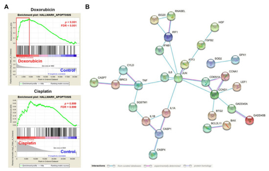 Gene set enrichment analysis (GSEA) for doxorubicin- and cisplatin-treated HeLa cells. (A) The enrichment plots for the apoptosis hallmark in doxorubicin- and cisplatin-treated HeLa cells. The leading edge genes are highlighted in the red squares. (B) The leading edge genes in doxorubicin-treated HeLa cells were analyzed using the STRING database for network construction.
