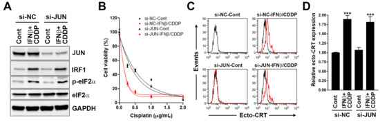 Effects of JUN knockdown on sequential interferon β (IFNβ)-cisplatin treatment-induced cell viability inhibition and immunogenic cell death (ICD) biomarker expression in HeLa cells. (A) HeLa cells were transfected with JUN siRNA (si-JUN) or the non-targeting control siRNA (si-NC) for 24 h, and then sequentially treated with 100 ng/mL IFNβ for 24 h and 2 μg/mL cisplatin for another 4 h. Protein expressions were analyzed by Western blotting. (B) JUN siRNA-transfected HeLa cells were treated with 100 ng/mL IFNβ for 48 h, and then cells were replated in 96-well plates and treated with the indicated doses of cisplatin for 72 h. Cell viability was examined by MTT assay. (C) JUN siRNA-transfected HeLa cells were sequentially treated with 100 ng/mL IFNβ for 24 h and 2 μg/mL cisplatin for another 24 h. Surface CRT (ecto-CRT) staining was performed and analyzed by flow cytometry. The mean fluorescence intensity in each treatment (the red line) was compared with that in untreated si-NC-transfected HeLa cells (the black line). (D) The mean fluorescence of ecto-CRT in (C) was quantified and plotted. p < 0.001 (***) indicates significant differences compared to control samples.