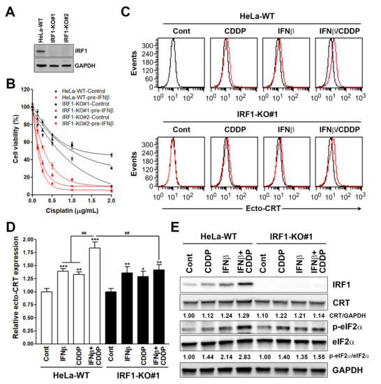 According to the above bioinformatics analyses, we first investigated the role of JUN in sequential IFNβ-cisplatin-induced growth inhibition, surface CRT exposure, and eIF2α phosphorylation by knocking down its expression using siRNA (Figure 5A). We found that sequential IFNβ-cisplatin treatment did not induce JUN expression. In addition, knockdown of JUN did not affect sequential IFNβ-cisplatin-induced IRF1 expression and eIF2α phosphorylation (Figure 5A), the cell viability inhibition (Figure 5B), or ecto-CRT expression (Figure 5C,D). We then investigated the role of IRF1 in sequential IFNβ-cisplatin-induced growth inhibition, surface CRT exposure, and eIF2α phosphorylation using the IRF1-knockout HeLa cells (Figure 6A). As shown in Figure 6B, knockout of IRF1 attenuated the cell viability inhibition by cisplatin with or without IFNβ pretreatment. Moreover, sequential IFNβ-cisplatin-induced ecto-CRT expression and eIF2α phosphorylation were attenuated by IRF1 knockout (Figure 6C–E and Figure S3). Therefore, upregulation of IRF1 by IFNβ was required for sequential IFNβ-cisplatin-induced surface CRT exposure. Interestingly, oxaliplatin-induced surface CRT exposure was also attenuated in IRF1-knockout HeLa cells (Figure S2), supporting the essential role of IRF1 in ICD.