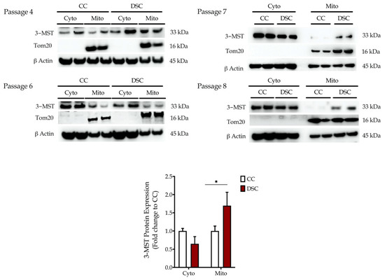 3-MST accumulates in the mitochondria of Down syndrome cells (DSC) compared to healthy control cells (CC) as shown by Western blotting. Top panels: chemiluminescence images of 3-MST protein expression in cytosolic (Cyto)- and mitochondrial (Mito)-enriched fractions of the selected healthy control fibroblast (Detroit 551; CC) and the Down syndrome fibroblast (Detroit 539; DSC). Experiments using four different cell passages are shown. The Western-blot analysis utilized β-actin as a loading control. The outer mitochondrial membrane transport protein Tom20 served as a control for the purity of the mitochondrial-enriched fractions. Bottom graph: statistical analysis of the healthy control fibroblast (Detroit 551; CC) and the Down syndrome fibroblast (Detroit 539; DSC). * p < 0.05.