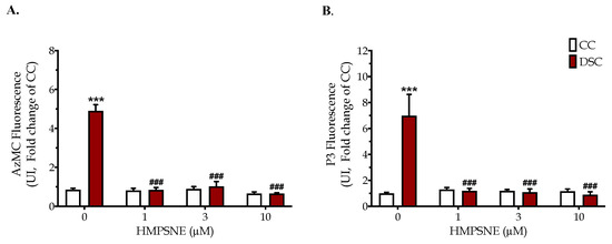 The 3-MST inhibitor HMPSNE suppresses H2S levels in Down syndrome cells. Fluorescence values of the H2S probe AzMC (A) and P3 (B) are shown in healthy control Detroit 551 fibroblasts (CC) and in Down syndrome Detroit 539 (DSC) fibroblasts under baseline conditions and when treated with 1, 3 or 10 µM HMPSNE for 24 h. Each bar represents the mean ± SEM of 4 independent experiments. *** p < 0.001 indicates a significant increase in fluorescence in DSCs vs. CCs; ### p < 0.001 indicates a significant inhibitory effect of HMPSNE on cellular H2S levels in DSCs.