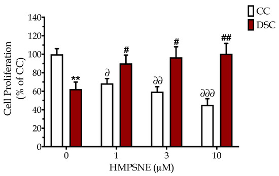 The 3-MST inhibitor HMPSNE concentration-dependently restores the cell proliferation rate in Down syndrome cells. BrdU incorporation assay was used to quantify cell proliferation of normal Detroit 551 (CC) and Down syndrome Detroit 539 (DSC) fibroblasts under baseline conditions and when treated with 1, 3 or 10 µM HMPSNE for 24 h. Each bar represents the mean ± SEM from at least 3 independent experiments. ** p < 0.01 indicates that baseline cell proliferation was significantly lower in DSCs than in CCs; ∂ p < 0.05 ∂∂ p < 0.01 and ∂∂∂ p < 0.001 indicate the significant inhibitory effects of HMPSNE on the proliferation of CCs; # p < 0.05 and ## p < 0.01 indicate the significant stimulatory effect of HMPSNE on the proliferation of DSCs.