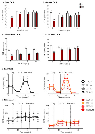 The 3-MST inhibitor HMPSNE normalizes the suppressed oxidative phosphorylation in DS cells. (A) Basal OCR; (B) Maximal OCR; (C) Proton-Leak OCR; (D) ATP-Linked OCR; (E) Total OCR; (F) Total ECAR. Cellular bioenergetics was quantified with the Seahorse extracellular flux analyzer. Each bar and line represent the mean ± SEM from at least 3 independent experiments of the selected normal Detroit 551 (CC) and Down syndrome Detroit 539 (DSC) fibroblasts under baseline conditions and when treated with 1, 3 or 10 µM HMPSNE for 24 h. * p < 0.05, ** p < 0.01, and *** p < 0.001 indicate that basal metabolic parameters were significantly lower in DSCs than in CCs; # p < 0.05 and ## p < 0.01 indicate a significant stimulatory effect of HMPSNE in DSCs compared to the values in the absence of the 3-MST inhibitor.