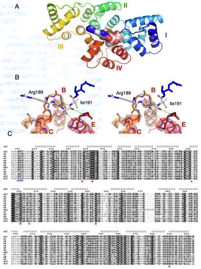 Comparisons with other Anxs show that the segment 189–192 is a conserved motif in the Anx family. The only Anx that does not contain the motif at the sequence level is AnxA13; conservation is weak for AnxA1 and AnxA8. The 4-residue segment forms conserved interactions with the ends of helices in domain IV (Figure 3B). These interactions are mainly comprised of main-chain hydrogen bonds, which explains the mode of conservation and the importance of the Gly residue in the motif. Interestingly, it has been proposed that AnxA11 is the common ancestor of all mammalian Anxs [], except for AnxA7 and AnxA13—the two phylogenetically oldest Anxs []. Thus, the AnxA11 core domain has the highest similarity to the other mammalian Anxs, acting as a sort of prototype [].