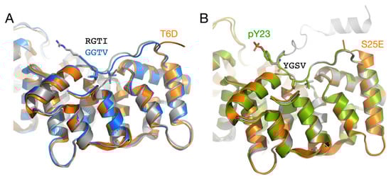 Regulation of the RGTI motif via phosphorylation in other annexins. (A) Comparison of AnxA11 (grey) with AnxA4 (blue) []. The structure of the phosphomimicking AnxA4 T6D mutant [] is shown in orange and has an open conformation. (B) Three states of AnxA2 []. The nonphosphorylated protein is in grey, AnxA2 phosphorylated on Tyr23 in green, and the open conformation of S25E in orange.