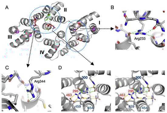 Five mutations have thus far been described in ALS patients within the AnxA11 core: S229R, R235Q, R302C, R346C, and G491R; in addition, G189E is located two residues before the start of the crystallised rat AnxA11 construct [,]. In the 3D structure, the AnxA11 mutations can be observed clustered at two locations (Figure 6A). Interestingly, three of these mutations involve a buried Arg residue, and a close look at the alignment reveals that these Arg residues are fully conserved in all rat Anxs. The remaining two mutations replace an exposed, non-conserved, small residue with an Arg. Details of the environment of each of the three conserved Arg residues are shown in Figure 6B–D. In brief, two of them coordinate carbonyl groups at C termini of helices, and one is involved in a conserved extended buried network of salt bridges between domains II and IV. These locations suggest that the ALS mutations involving these conserved Arg residues will have effects on AnxA11 folding and/or stability.