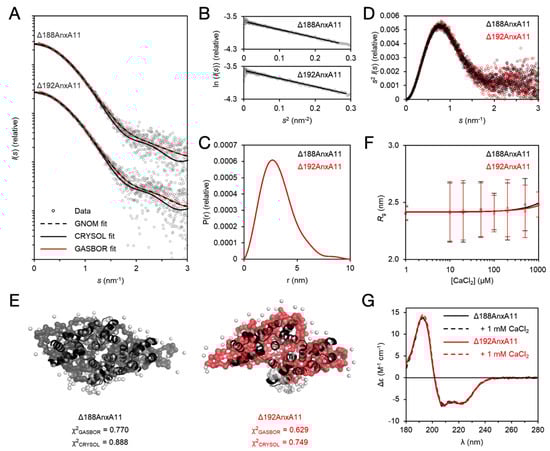 Similarly to most Anxs, AnxA11 has been implicated in Ca2+ binding [,]. Structural studies of many Anxs have revealed Ca2+ binding to the convex side of the core structure, essentially through coordination by acidic residues. To test for effect of Ca2+ on the folding of the core structure of AnxA11, we titrated Δ188AnxA11 and Δ192AnxA11 with CaCl2 in SAXS and followed the radius of gyration (Rg; Figure 7F). The Rg of both truncated proteins remained the same up to 1 mM CaCl2. Additionally, we carried out SRCD spectroscopy of Δ188AnxA11 and Δ192AnxA11 in the absence and presence of 1 mM CaCl2 (Figure 7G). The spectral quality was excellent, with the data being truncated at 178 nm. The presence of Ca2+ did not alter the spectra, indicating that Ca2+ does not influence the secondary structure content of the core structure. This result confirms that Δ192AnxA11 is folded despite its dramatic decrease in thermal stability, and that the degree of secondary structure content between the two variants is nearly identical. Ca2+ induced a large thermal stabilisation of FL-AnxA11, indicated by a rise in Tm of ~14 °C []. The presence of up to 75 mM Ca2+ only induced small increases in AnxA11 α-helical content []. Thus, Ca2+ binding results in only local conformational changes, which primes AnxA11 for lipid membrane binding.
