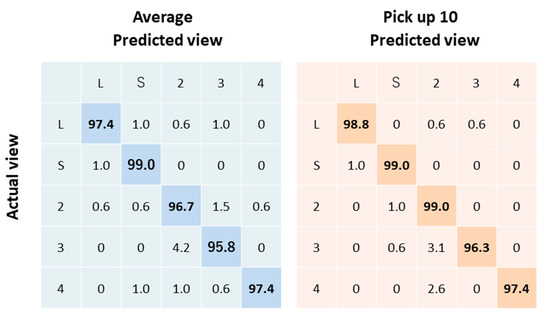 We tested models trained by two sets of data consisting of averaged images, and 10 selected images in the independent cohort (n = 189). Our best model (from 10 selected images) classified videos into five views with 98.1% overall test accuracy (Figure 3). The weighted kappa was 0.98 ± 0.005 (95%CI: 0.971 to 0.989).