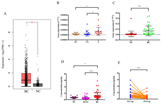 CAMP mRNA and cathelicidin antimicrobial peptide is upregulated in breast cancer. (A) CAMP expression data in normal controls and breast cancer tumor tissues from The Cancer Genome Atlas (TCGA) database; (B) CAMP mRNA expressions in normal controls, breast cancer patients’ tumor tissues and tumor adjacent normal tissues; (C) CAMP mRNA expression in normal controls and breast cancer patients’ plasma; (D) serum concentration of peptide LL-37 in normal controls, DCIS, and breast cancer patients; (E) serum LL-37 levels of pre-/post-operation breast cancer patients. * p < 0.05, ** p < 0.01, *** p < 0.001 indicates statistically different. (NC: normal control; BC: breast cancer; TN: tumor adjacent normal tissue; T: breast cancer tissue).