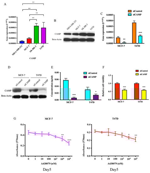 CAMP inhibition significantly decreased cell viability in breast cancer cells. (A) CAMP mRNA expression and protein level (B) in breast cancer cell lines; qRT-PCR (C) and Western blotting results (D) showed that CAMP was significantly suppressed by siRNA; (E) secreted CAMP peptide level in cell culture medium was detected by ELISA in breast cancer cells; (F) MTT assay after CAMP siRNA in breast cancer cells; (G) CAMP receptor specific antagonist, A438079inhibited cell proliferation. * p < 0.05, ** p < 0.01, *** p < 0.001 indicates statistically different.