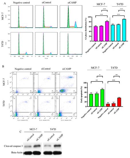 CAMP knockdown altered cell cycle progression and apoptosis. (A) Significantly increased G1 phase arrest was observed in both cell lines after CAMP knockdown (negative control: parental breast cancer cells); (B) early apoptotic cells were induced upon CAMP siRNA (negative control: parental breast cancer cells); (C) Western blot result of cleaved caspase-3 in breast cancer cells after CAMP knockdown. * p < 0.05, ** p < 0.01, *** p < 0.001 indicates statistically different.
