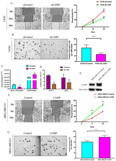To further elucidate the functional implication of CAMP in breast cancer, we investigated the expression of CAMP in different breast cancer cell lines (MDA-MB-231: triple-negative breast cancer; MCF-7: estrogen receptor-positive; SK-BR-3: HER2-positive; T47D: estrogen receptor-positive) by qRT-PCR (Figure 2A) and Western blotting (Figure 2B). Knockdown of CAMP decreased mRNA expression, protein level, and secreted CAMP protein (Figure 2C–E). MTT assay result confirmed that siCAMP led to significant growth inhibition in MCF-7 and T47D cell lines (Figure 2F) but not in SK-BR-3 (data not shown). Treatment with CAMP receptor-specific antagonist, A438079, dose-dependently inhibited breast cancer cell growth (Figure 2G). Cell cycle analysis suggested a significant G1 phase arrest in CAMP-deficient cells (Figure 3A). CAMP knockdown also led to robust increase in early apoptotic cells (Figure 3B) along with increased cleaved Caspase 3 expression (Figure 3C). Both cell migration ability (Figure 4A) and invasiveness (Figure 4B) were suppressed upon CAMP knockdown in T47D cells, which may be due to increased CDH1 and decreased ALDH activity (Figure 4C,D). To consolidate this result, we developed stable CAMP overexpressing MDA-MB-231 cells (Figure 4E) and found that ectopic CAMP expression enhanced migration and invasion ability (Figure 4F,G).