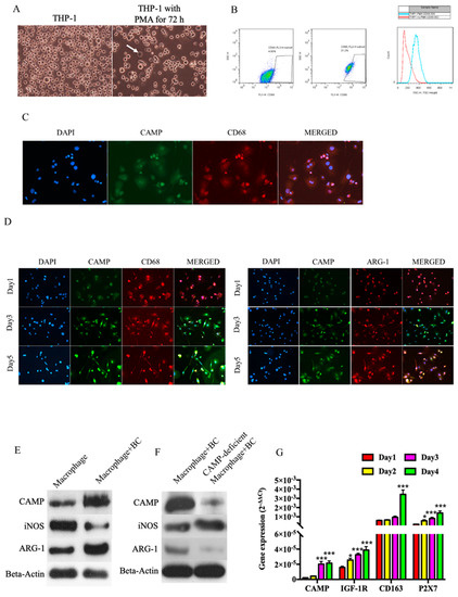 CAMP played an important role in the transition from M0 to M2 macrophages. (A) Non-specific macrophages were differentiated from THP-1 cells by phorbol 12-myristate 13-acetate (PMA) treatment; (B) flow cytometry result showed that CD68+ve cells population increased upon PMA treatment; (C) immunofluorescence (IF) staining of CD68 and CAMP in differentiated macrophages from THP-1 cells; (D) IF staining of CAMP, CD68, and ARG-1 in macrophage co-cultured with breast cancer cells; (E) Western blotting showed that iNOS decreased while ARG-1 and CAMP increased in macrophage during co-culture with breast cancer cells; (F) ARG-1 protein expression decreased and iNOS decreased in CAMP-deficient macrophages co-cultured with breast cancer cells compared to control group; (G) mRNA expression levels of CAMP, M2 marker CD163, CAMP-specific receptor P2X7, and IGF-1R were increased in macrophages cultured in conditioned medium. * p < 0.05, *** p < 0.001 indicates statistically different.
