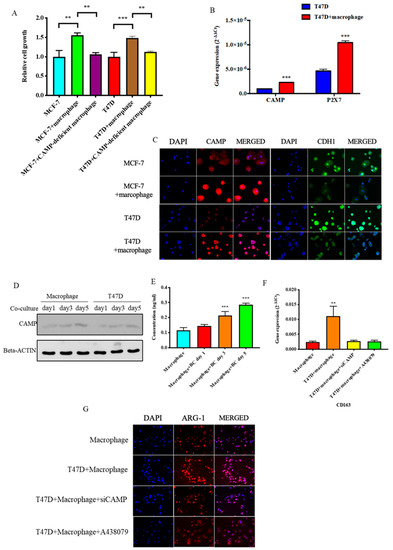 CAMP contributed in the interaction between tumor-associated macrophages (TAMs) and cancer cells. (A) Cell proliferation ability was significantly enhanced in both breast cancer cells after co-culture with TAMs but not with CAMP-deficient macrophages; (B) both CAMP and its receptor P2X7 expressions were upregulated in breast cancer cells after co-cultured with TAMs; (C) IF staining showed increased immunofluorescence intensity of CAMP and decreased intensity of CDH1 in breast cancer cells co-cultured with TAMs; (D) Western blot analysis showed CAMP protein level increased with time in breast cancer cells co-cultured with macrophages; (E) secreted CAMP protein level was detected by ELISA in co-culture medium of macrophages and breast cancer cells; (F) qRT-PCR and (G) IF staining showed that upregulation of ARG-1/CD163 induced in macrophages after co-culture with cancer cells was abrogated by CAMP knockdown. ** p < 0.01, *** p < 0.001 indicates statistically different.