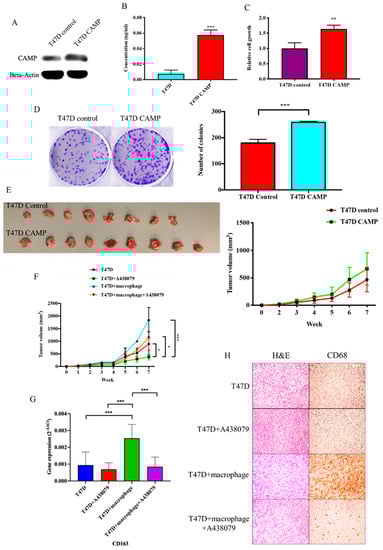 CAMP is essential for the tumor promoting effect of TAMs in vivo. (A) Western blotting confirmed CAMP is upregulated in stable T47D CAMP overexpressing cells; (B) secreted CAMP protein level was higher in CAMP overexpressing cells’ culture medium than in the control group; (C) CAMP overexpression increased cell viability in breast cancer cells; (D) more colonies were observed in the CAMP overexpressing group than the control group; (E) CAMP overexpression groups exhibited larger tumor volumes than the control group; (F) the tumor promoting effect of TAMs was abolished by A438079; (G) CD163 mRNA expression in mice tissues; (H) IHC staining of human CD68 expression in mice tumors. * p < 0.05, ** p < 0.01, *** p < 0.001 indicates statistically different.