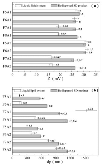 Figure 1. Comparison between the experimental results of zeta potential (Z), emulsion size (dp), and polydispersity index (PI) of the liquid and redispersed dried lipid systems, (ac), respectively. Same letters/numbers indicate a statistically significant difference (Tukey’s post-test, p ≤ 0.05).