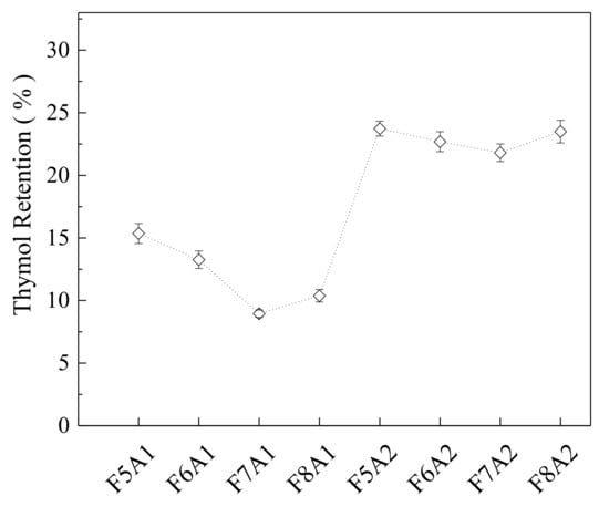 Figure 2. Retention of thymol in the spray dried product. Percentage relative to the initial concentration of thymol in essential oil.
