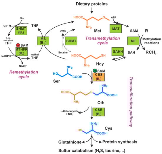 Role of CBS and other enzymes in the regulation of mammalian sulfur amino acid metabolism. Methionine (Met), an essential amino acid taken from dietary proteins, is condensed with ATP by methionine adenosyltransferase (MAT) to form S-adenosylmethionine (SAM). SAM serves as a universal methyl donor for multiple methylation reactions catalyzed by various methyltransferases (MT) yielding methylated product and S-adenosylhomocysteine (SAH). SAH is subsequently hydrolyzed by SAH hydrolase (SAHH) into adenosine and homocysteine (Hcy). Hcy is then distributed between two competing pathways. To conserve Met, Hcy is remethylated back to Met by the action of either liver-dependent betaine homocysteine methyltransferase (BHMT) or ubiquitous methionine synthase (MS) using betaine and methyl tetrahydrofolate (methyl-THF), respectively, as the methyl donor. To generate Cys, Hcy is irreversible diverted from the methionine cycle to the transsulfuration pathway by cystathionine beta-synthase (CBS)-catalyzed condensation with serine (Ser) forming cystathionine (Cth), which is subsequently hydrolyzed by cystathionine gamma-lyase (CSE, an enzyme also referred to as “CGL” in the literature) into cysteine (Cys). Importantly, SAM regulates the flux of Hcy through the competing pathways by allosteric activation of CBS and inhibition of methylenetetrahydrofolate reductase (MTHFR). Interestingly, all enzymes of the transsulfuration pathway and the remethylation (folate cycle) enzymes require assistance of a member of vitamin B family: B2 (riboflavin) in MTHFR, B6 (pyridoxine) in serine hydroxymethyltransferase (SHMT), CBS and CSE, B9 (folic acid) as a one-carbon carrier of the remethylation cycle, or B12 (cobalamin) in MS.