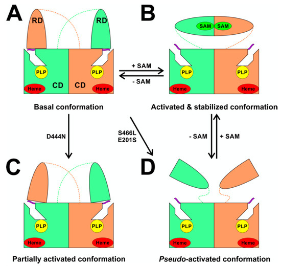 A model of SAM-mediated allosteric regulation of hCBS. (A)The engineered hCBSΔ516-525 construct is catalytically indistinguishable from the native hCBS WT, but assembles into dimers (light green and orange subunits) compared to native tetramers. Each subunit contains heme (in red oval) and PLP cofactor (in yellow circle). In the absence of SAM, the enzyme is in the basal conformation with low specific activity (~200 U/mg of protein), where the regulatory domain (RD) of one subunit interacts with the loops delineating entrance to the catalytic cavity of the other subunit (purple ribbon) and thus limits the activity of the complementary catalytic domain (CD). (B) Binding of SAM (in green oval) leads to a displacement of the regulatory domain away from the catalytic cavity and formation of a disk-shaped CBS module. Thus, auto-inhibition is released, and the enzyme is activated approximately 5-fold. Activated conformation is stabilized by the presence of SAM in the site S2. (C) Pathogenic mutations, such as Asp444Asn, may disrupt interaction between the RD and the CD as well as impair SAM binding thus yielding partially activated conformation. Such structural perturbation enables increased flexibility of the loops near the catalytic cavity and leads to an increased catalytic activity of the mutant enzyme. (D) Other mutations, such as the pathogenic Ser466Leu or artificial Glu201Ser, completely abolish interaction between the RD and the CD yielding a pseudo-activated conformation. If SAM binding is not impaired by the mutation, additional presence of SAM may result in the formation of CBS module and thus “true” activated and SAM-stabilized conformation. Reproduced by permission [195].