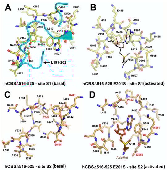 The loops are in a “closed” (collapsed) conformation when the substrate occupies the catalytic cavity or when the C-terminal regulatory domain sterically interferes and thus limits access to the PLP center. On the other hand, the loops are in an “open” (relaxed) conformation in the absence of the substrate in the PLP cavity or when the steric block imposed by the regulatory domain is relieved by its removal (in the truncated enzyme), binding of SAM or the presence of activating missense mutations, such as artificial Glu201Ser or pathogenic Asp444Asn [195,196] (Figure 5).