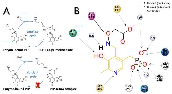 The CBS catalytic process and the function of its catalytically active PLP cofactor have been extensively studied in the past. The crystal structure of the truncated human CBS lacking the C-terminal regulatory domain revealed that the PLP cofactor is linked to the -amino group of Lys119 residue via a Schiff base linkage forming an internal aldimine [18,20]. The pyridinium nitrogen and the phenolic oxygen of the PLP cofactor form hydrogen bonds with Ser349 and Asn149 residues, respectively, while phosphate moiety of the PLP is stabilized by an extended hydrogen bonding network with residues of the Gly256-Thr257-Gly258-Gly259-Thr260 loop. Together, these residues anchor the PLP deeply in the protein matrix and the active site is accessible only through a narrow channel. Conformation of the loops delineating the PLP-containing cavity, namely L145-148, L171-174, and L191-202, defines accessibility of the catalytic center by the substrates and thus the activity of the enzyme (Figure 4) [19,194].